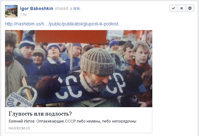 Однако, ближе к делу и в чем суть вопроса. Игорь периодически шерает в нашу группу материалы со своего «антироссийского» сайта. А я их с неприятным мне самому постоянством не пропускаю, прикрываясь тем, что группа у нас далека от политики, и что другие сайты, даже дружеские, мы по возможности на своей площадке не продвигаем (все так поступают, кто может, конечно), и тем, что для политики и политических споров вплоть до слюноразбрызгивания, а иногда и до рвоты, у нас есть специальная группа «Народный корпункт Горизонта» — https://www.facebook.com/groups/forum.gorizont — вот, мол, туда все и сгружайте, там все пускают.